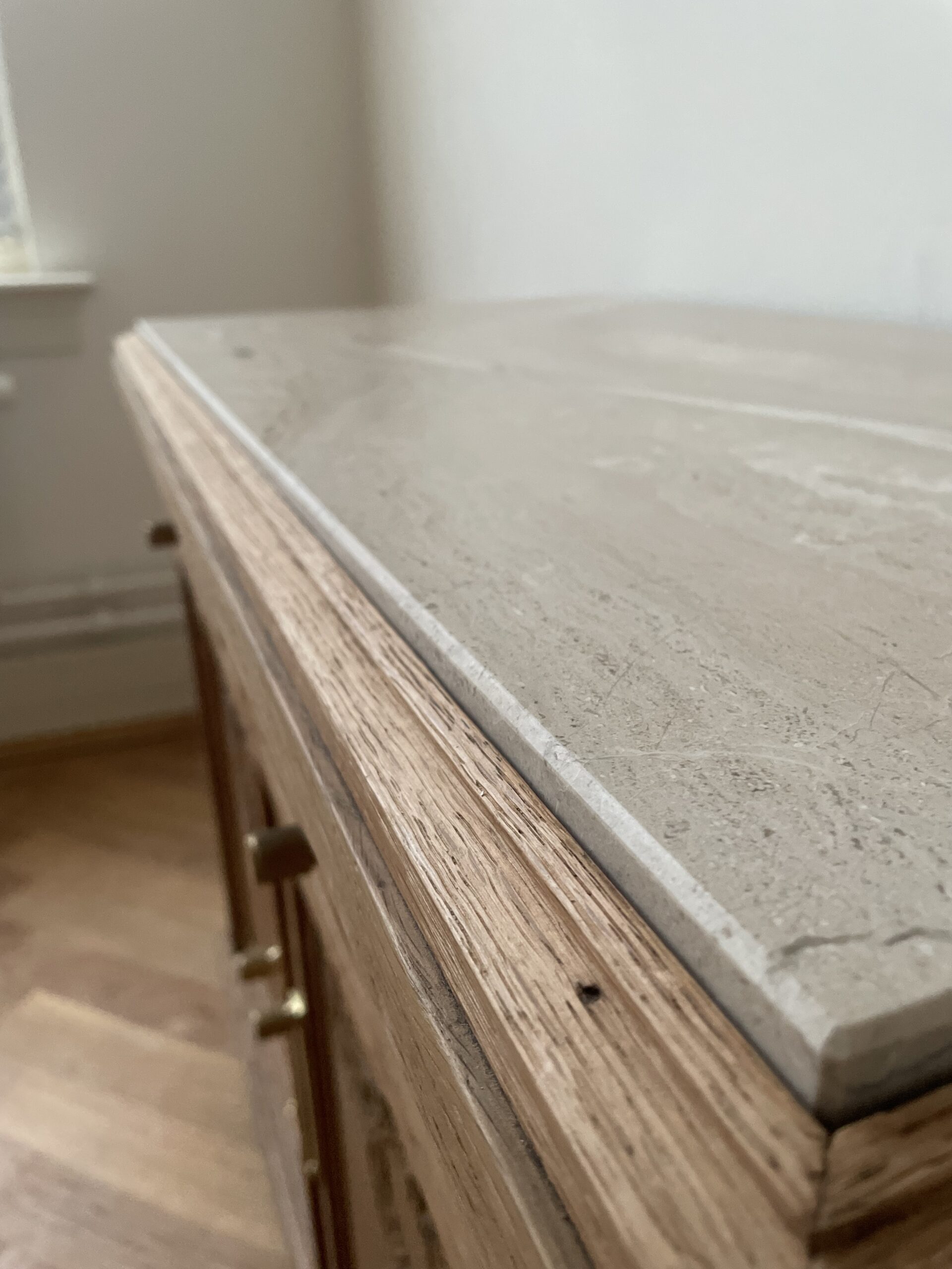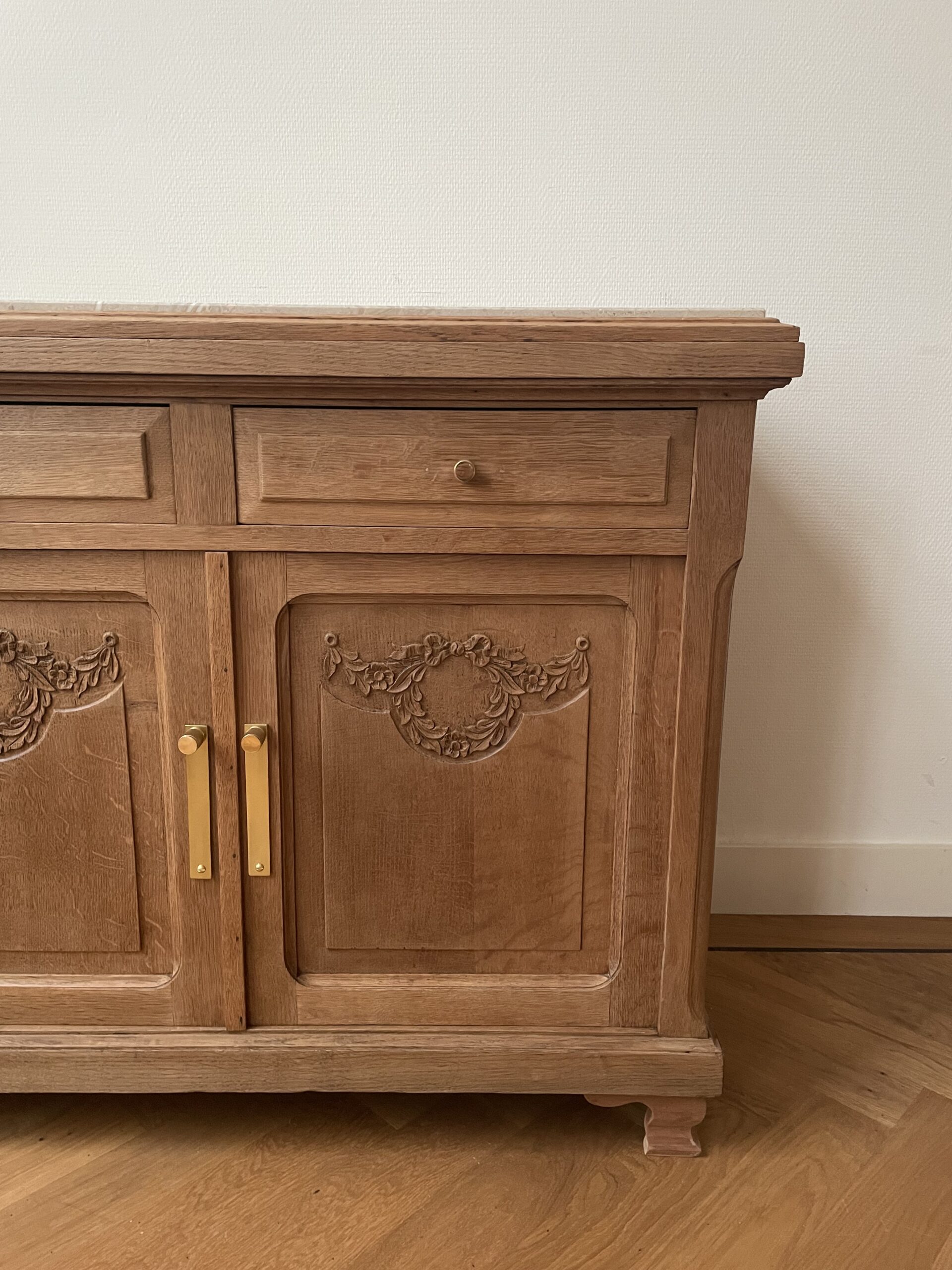 Door deze modernere materialen toe te voegen is Isa weer als nieuw. Een solide, massief eikenhouten dressoir met een nieuw travertin blad. Redesigned, uniek, duurzaam en klaar voor een nieuw interieur.