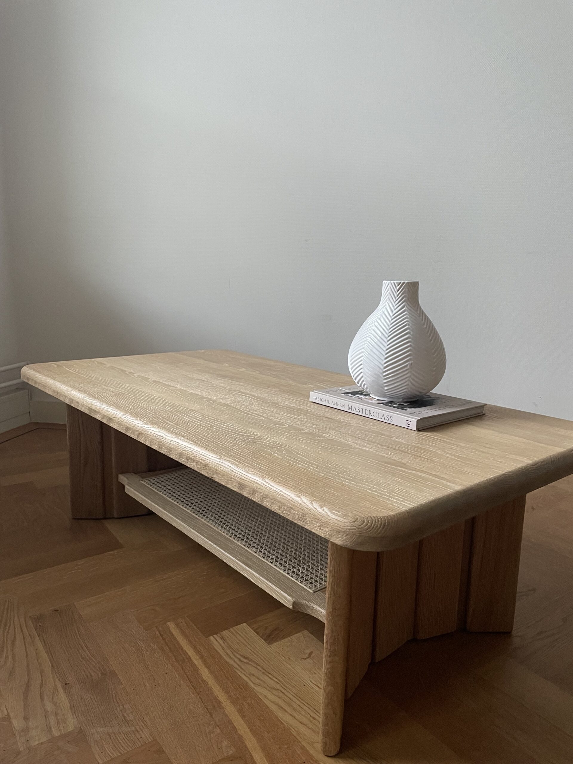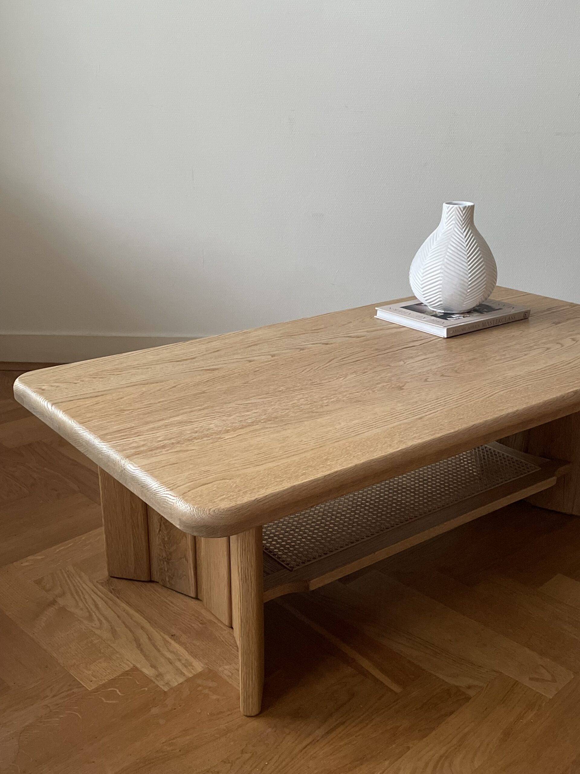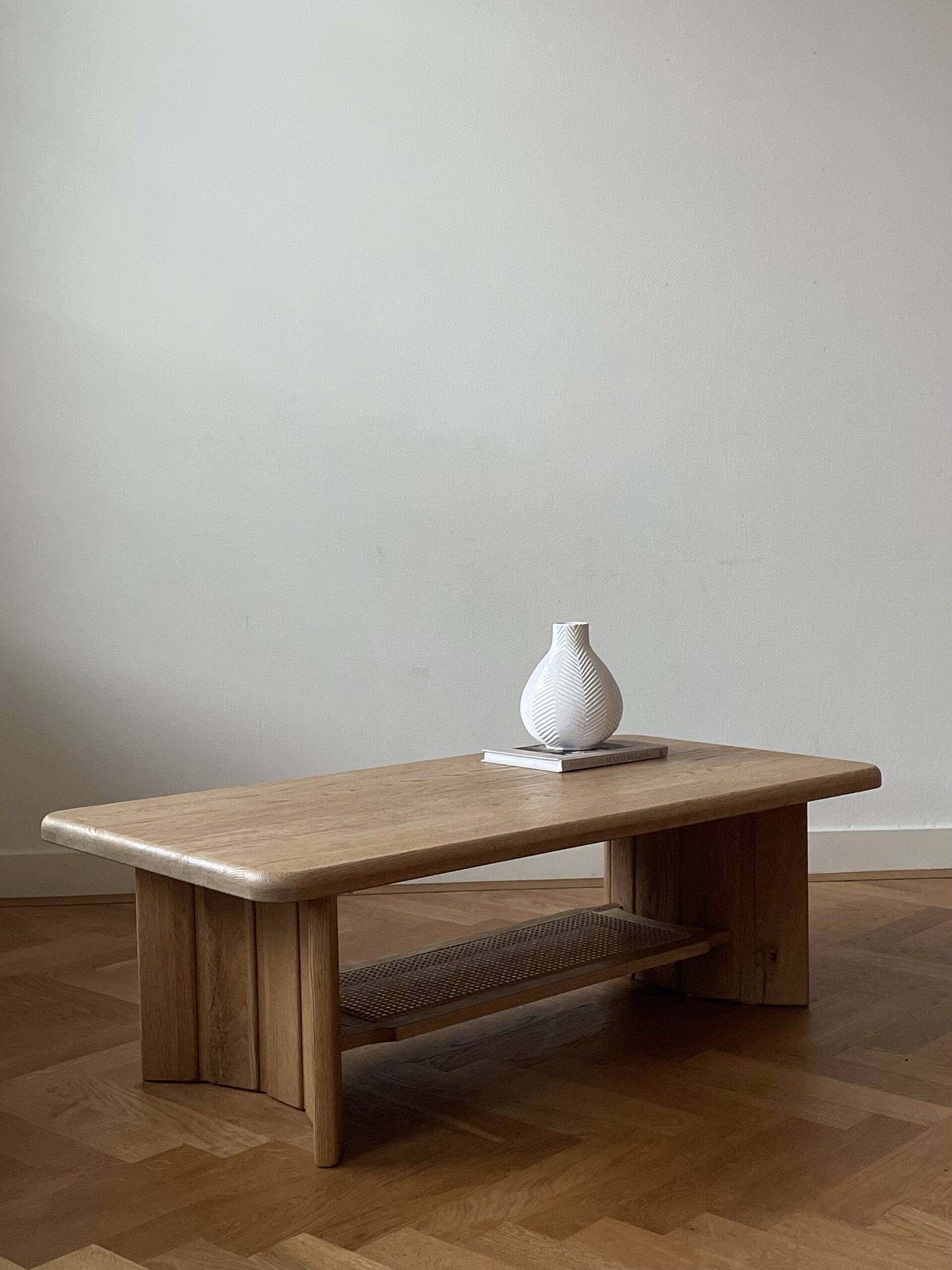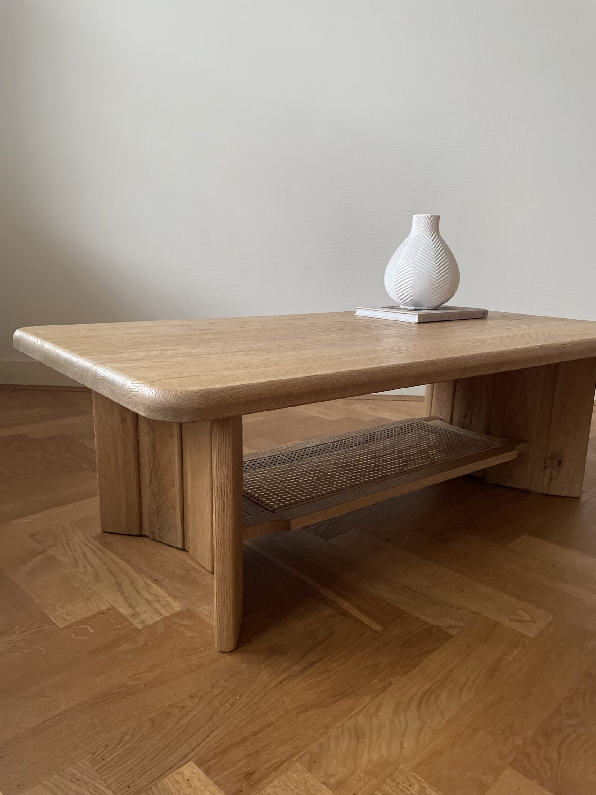 Deze vintage, solide salontafel had origineel een glimmende, donkerbruine kleur en coating. Daarom is ervoor gekozen haar te laten zandstralen, waarbij het eikenhout haar originele kleur weer terugkreeg en een robuuste grove houtnerf. Vervolgens is ze twee keer geschuurd met een grove en een fijne korrel en afgewerkt met twee lagen naturel beits. Om het meubel extra bescherming te geven is er een matte vernis aangebracht. Wil je Mylene in het echt komen bewonderen, maak dan gerust een afspraak voor in de showroom.